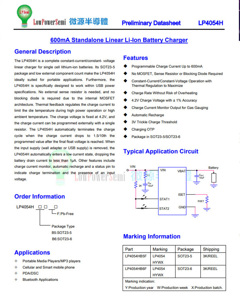 LOWPOWER微源LP4054H锂电池充电管理IC